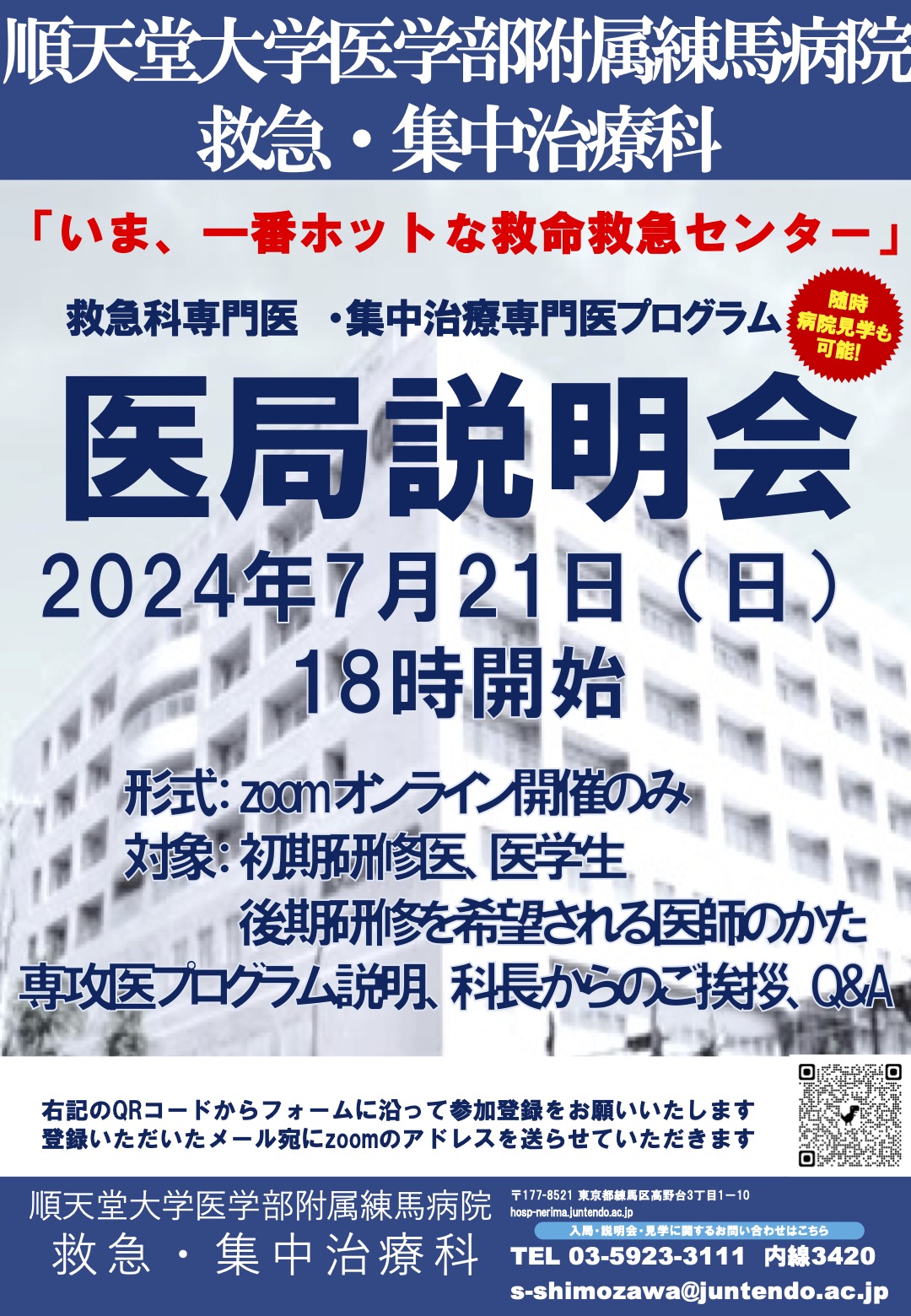 順天堂大学医学部附属練馬病院 救急科専門研修プログラムのオンライン説明会のご案内をさせて頂きます。もちろん専攻医プログラム以外の入局希望も随時募集しています。 日時: 詳細は添付ファイルご参照いただければと思います。 ご希望の方は参加いただけますと幸いです。何卒よろしくお願い申し上げます。 【当院・当科の特徴】 |