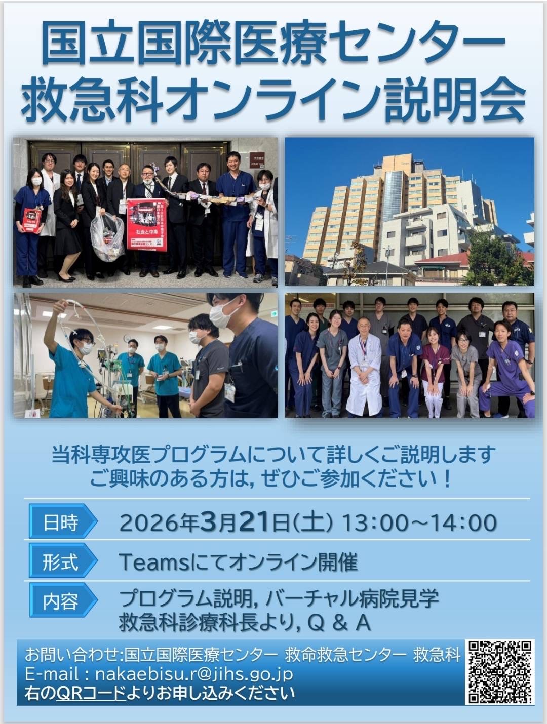 国立国際医療センター 救命救急センター 救急科の中夷黎と申します。 私たち国立国際医療センター 救命救急センター 救急科では、下記の通り救急科オンライン説明会を開催いたします。救急医療に少しでも興味のある方は、ぜひお気軽にご参加ください。