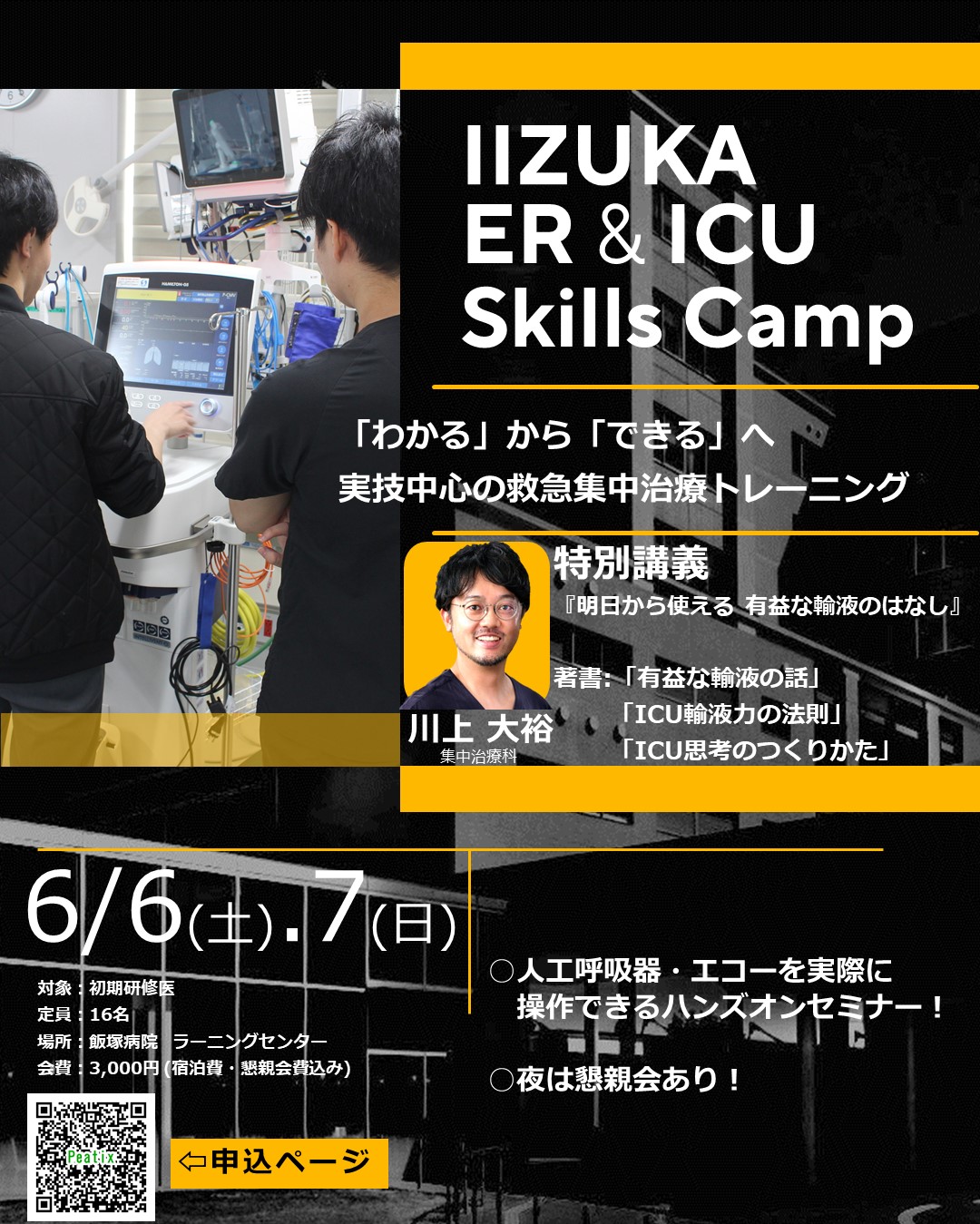 お世話になっております。飯塚病院 救急科・集中治療科です。 このたび飯塚病院では、「一人当直でも迷わず対応できる力を身につける」ことをテーマに、初期研修医の先生方を対象とした『IIZUKA ER&ICU Skills Camp』を開催いたします。 ○一人当直で判断に迷った経験がある そんな先生方に向けて、 ──────────────── |