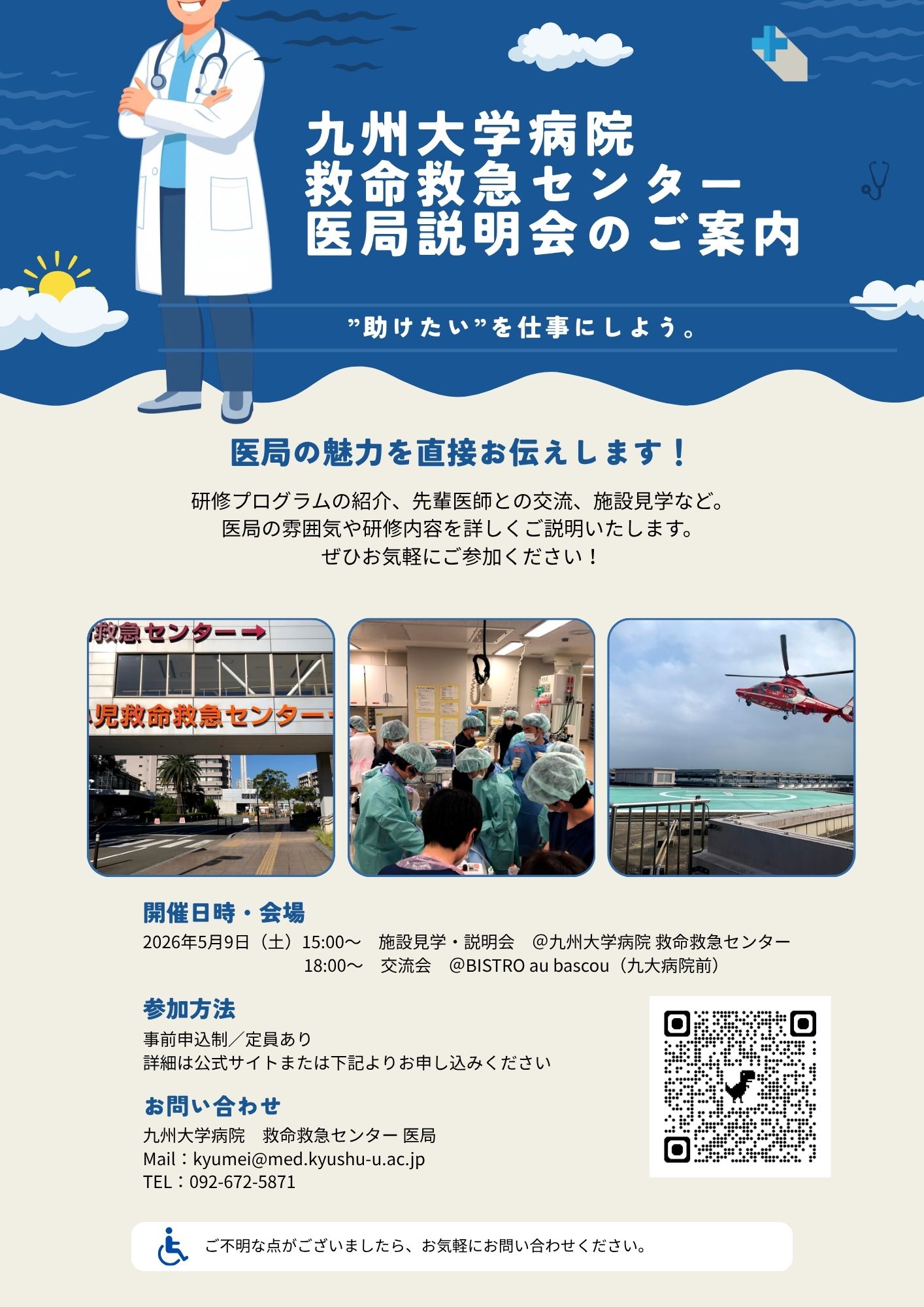 九州大学病院救命救急センターでは医局説明会を行います。当センターは小児救命救急センターと術後ICUも管理しており、小児から大人まで幅広く診療できる救急専門医・集中治療専門医の育成を目標としています。また希望にあわせてドクターカーやドクターヘリを要する連携施設での研修カリキュラムも有しております。