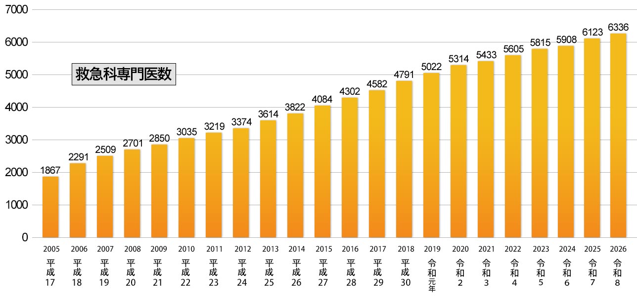 毎年、救急科専門医数は増加しています。しかし、米国との比較では、日本でおよそ13,000人以上必要(※)と試算されており、まだ6,000人台しかいない貴重な専門医資格です。