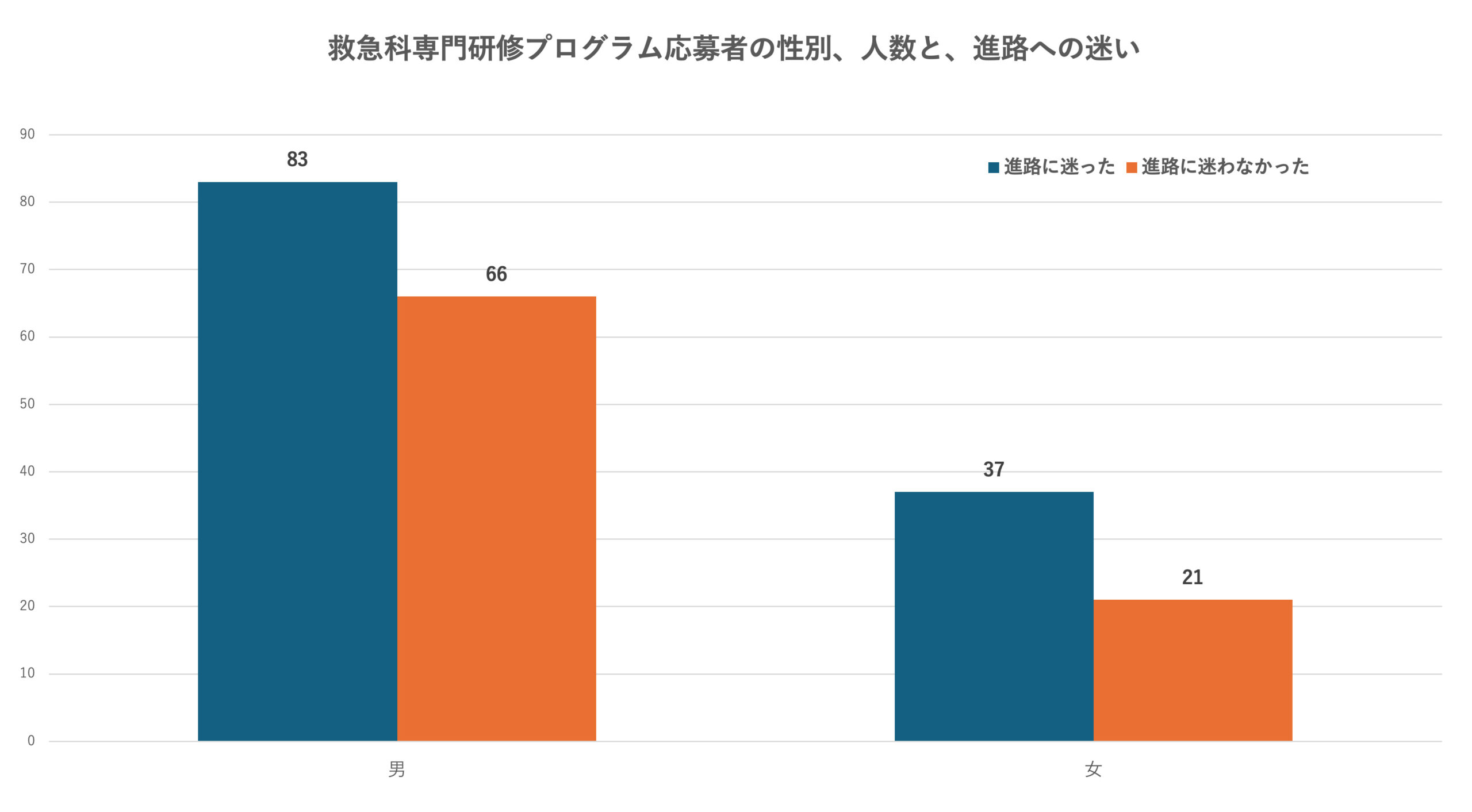 Q1救急科専門研修プログラム応募者の性別、人数と、進路への迷い