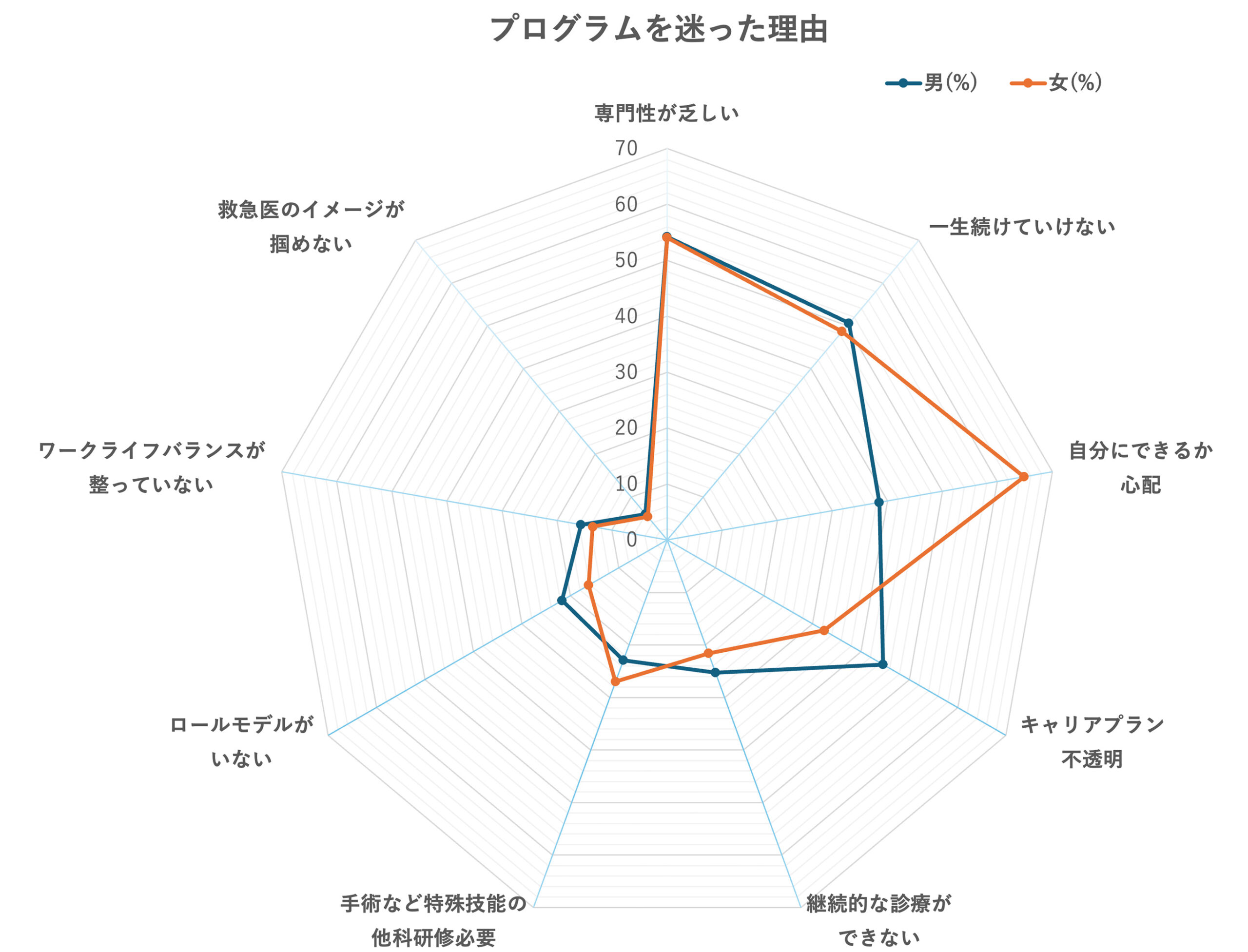 男女ともに半数以上の専攻医が他科と迷いながら救急科専門研修プログラムを選択されていました。