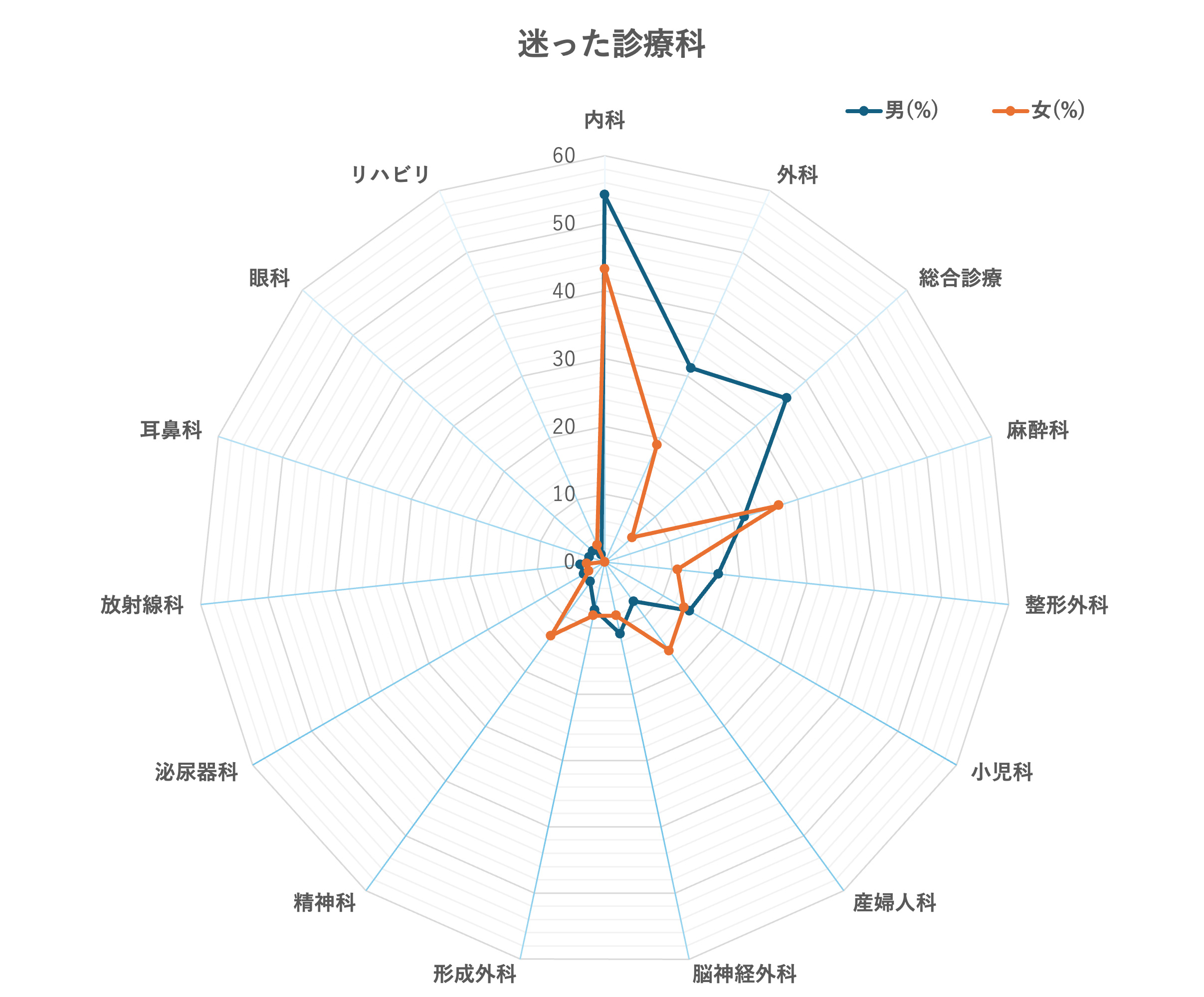 具体的に迷った診療科として、男性は内科、総合診療、外科をあげ、女性は内科、麻酔科、外科をあげる割合が高く、広い診療範囲に興味のある多様な集団であることが伺えます。