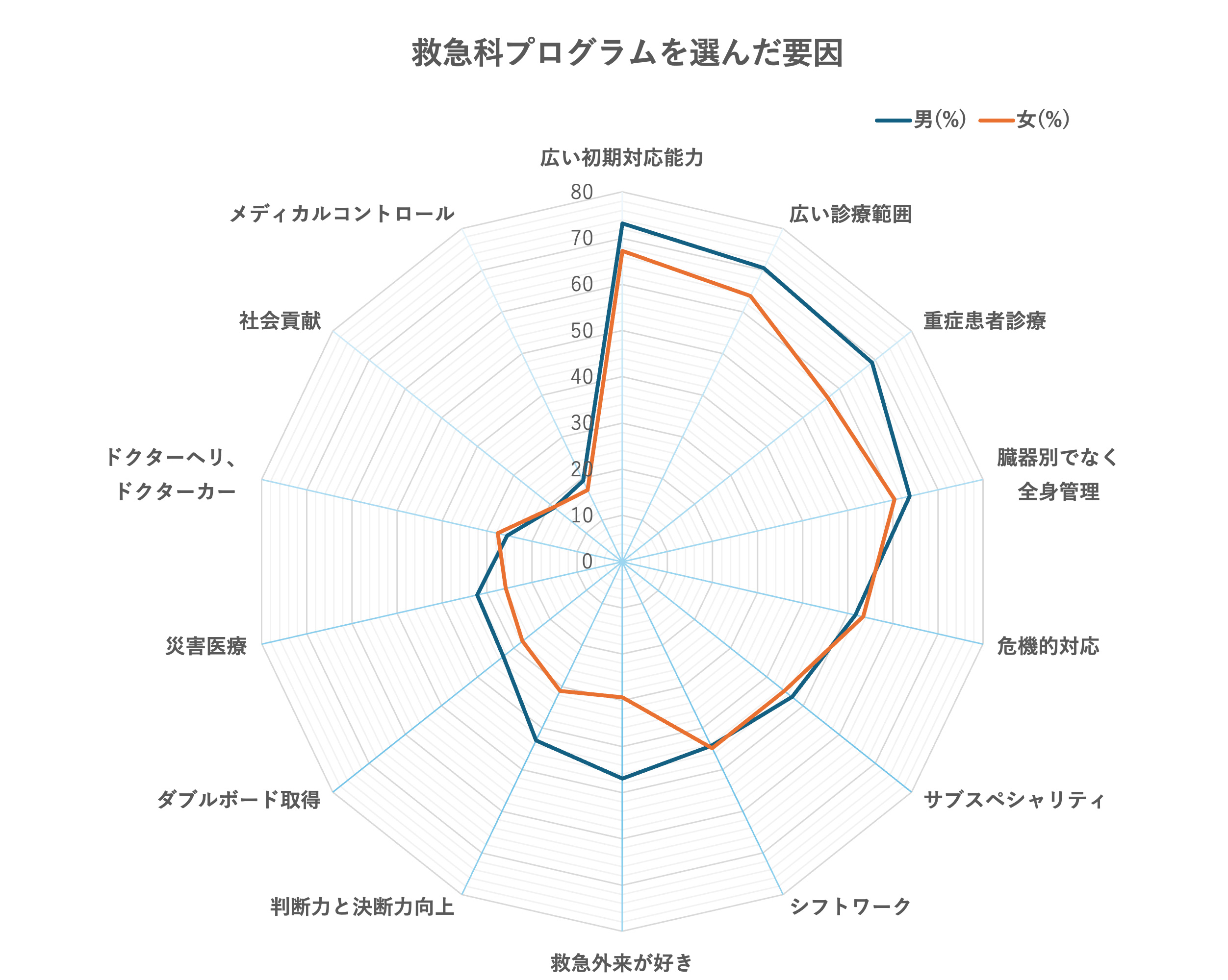 一方、救急科を選んだ理由は男女ともに同じ傾向が見られました。広い初期対応能力や診療範囲の広さ、重症対応、全身管理といったジェネラルな能力獲得を50−70%の専攻医が挙げました。またサブスペシャリティ、ダブルボード取得に興味も30-50%の方が挙げております。