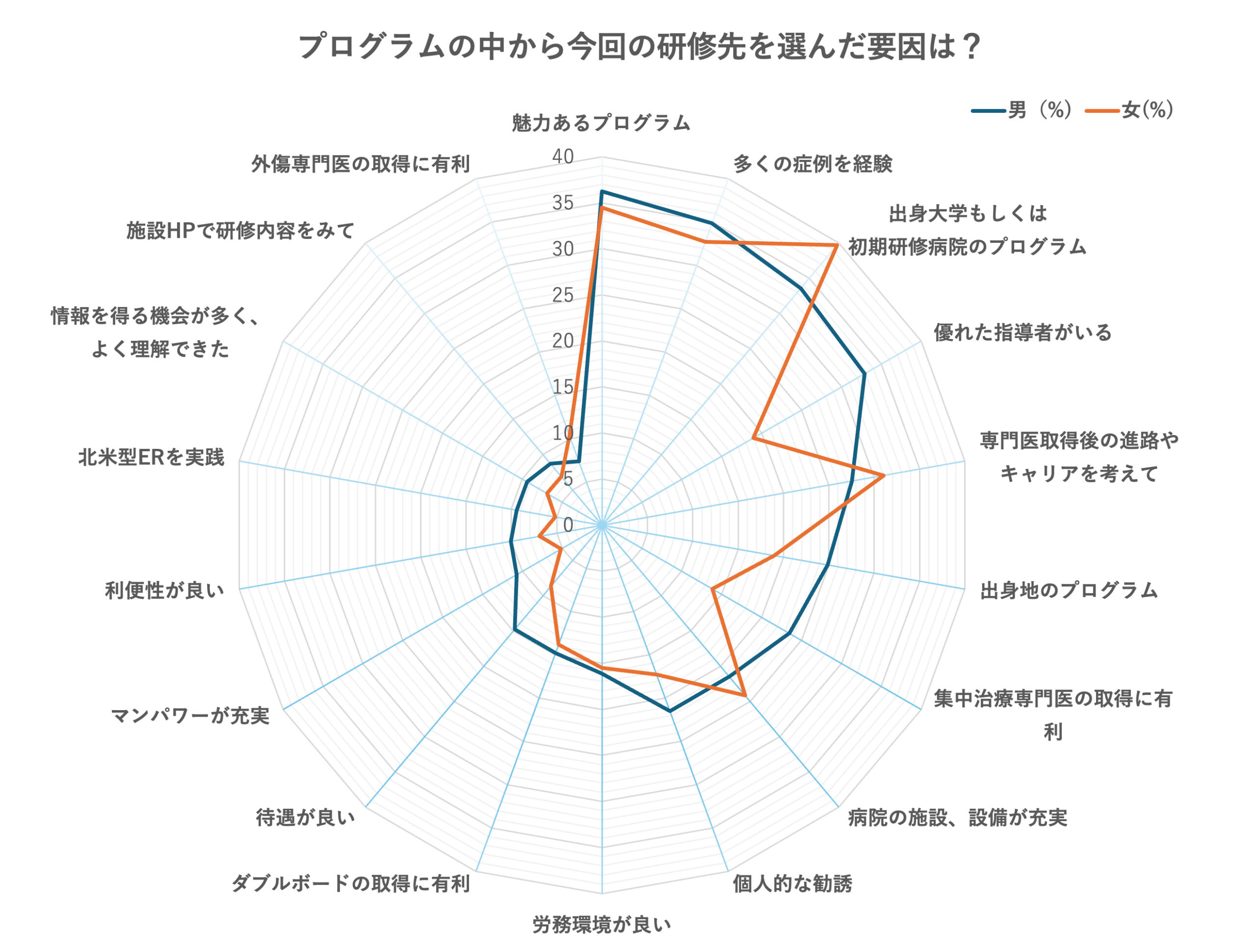 最終的に個々のプログラムの選択要因は、多くの症例の経験をあげている専攻医が多く、続いて出身大学や出身地のプログラム、個人的な勧誘や優れた指導医のいると言った、人や地域との繋がりを挙げていました。臨床に根差したしっかりとした能力の獲得と将来の人生設計をもとに選択している様子が伺えました。